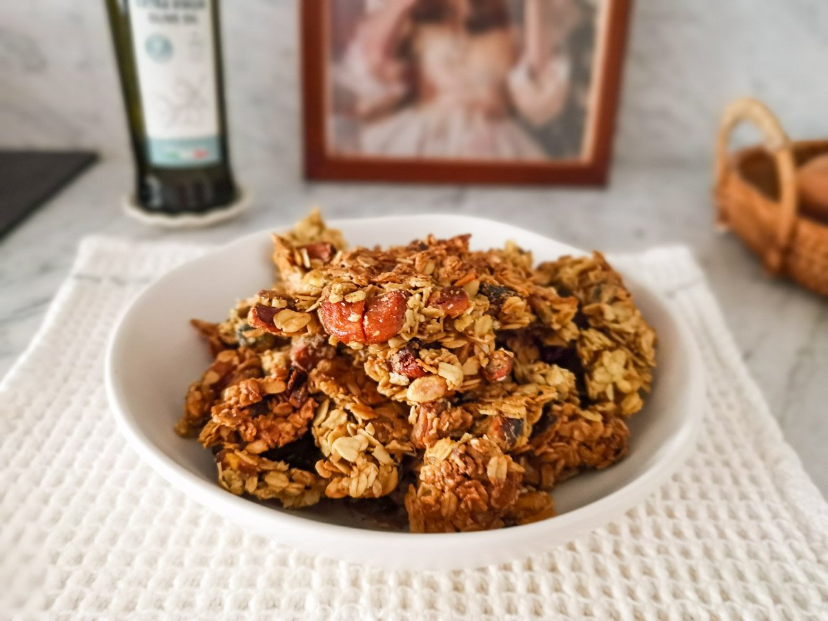 Then, start breaking the granola sheet with your clean hands into smaller chunks of your preferred size. Store them into glass jars or containers and use within the next days.