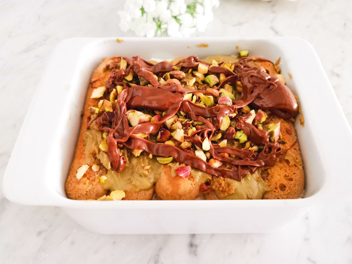 Repeat one more layer of dipped lady fingers, pistachio spread, and mascarpone.