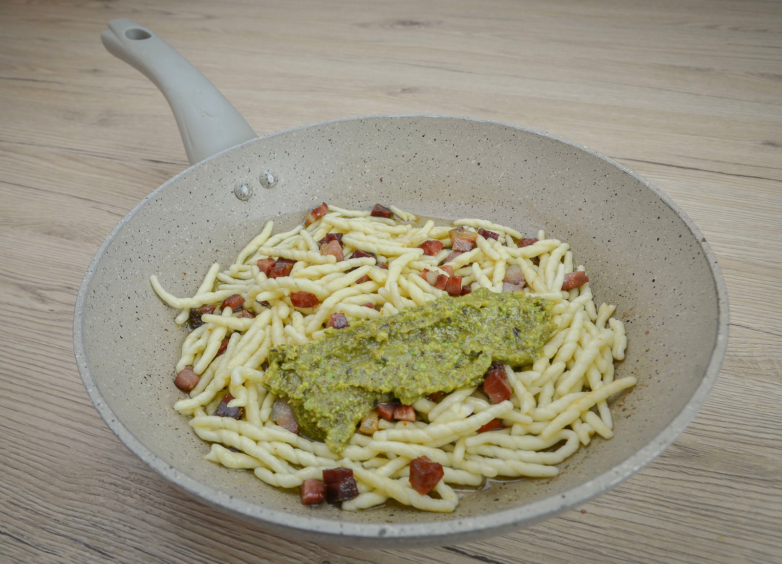 Drain and add the pasta to the pan with the oil and speck. Set some pasta water aside, just in case you think the pasta needs it.